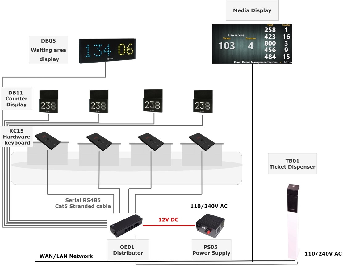 The Q-net Basic system works by having customers take a ticket from a dispenser, which is managed by a built-in mini PC. Clerks call the next number using a simple keypad, and the ticket number appears on a central display.